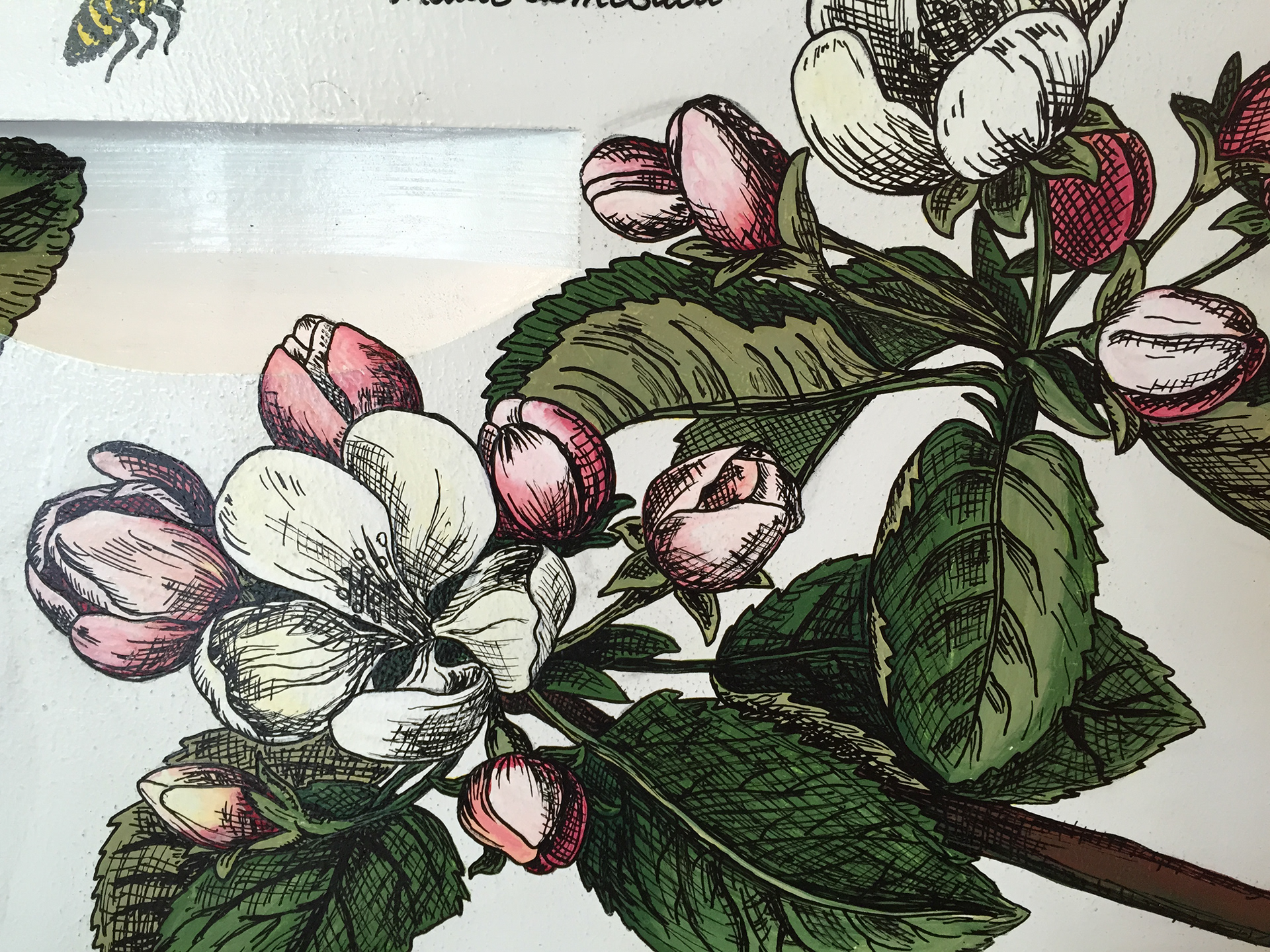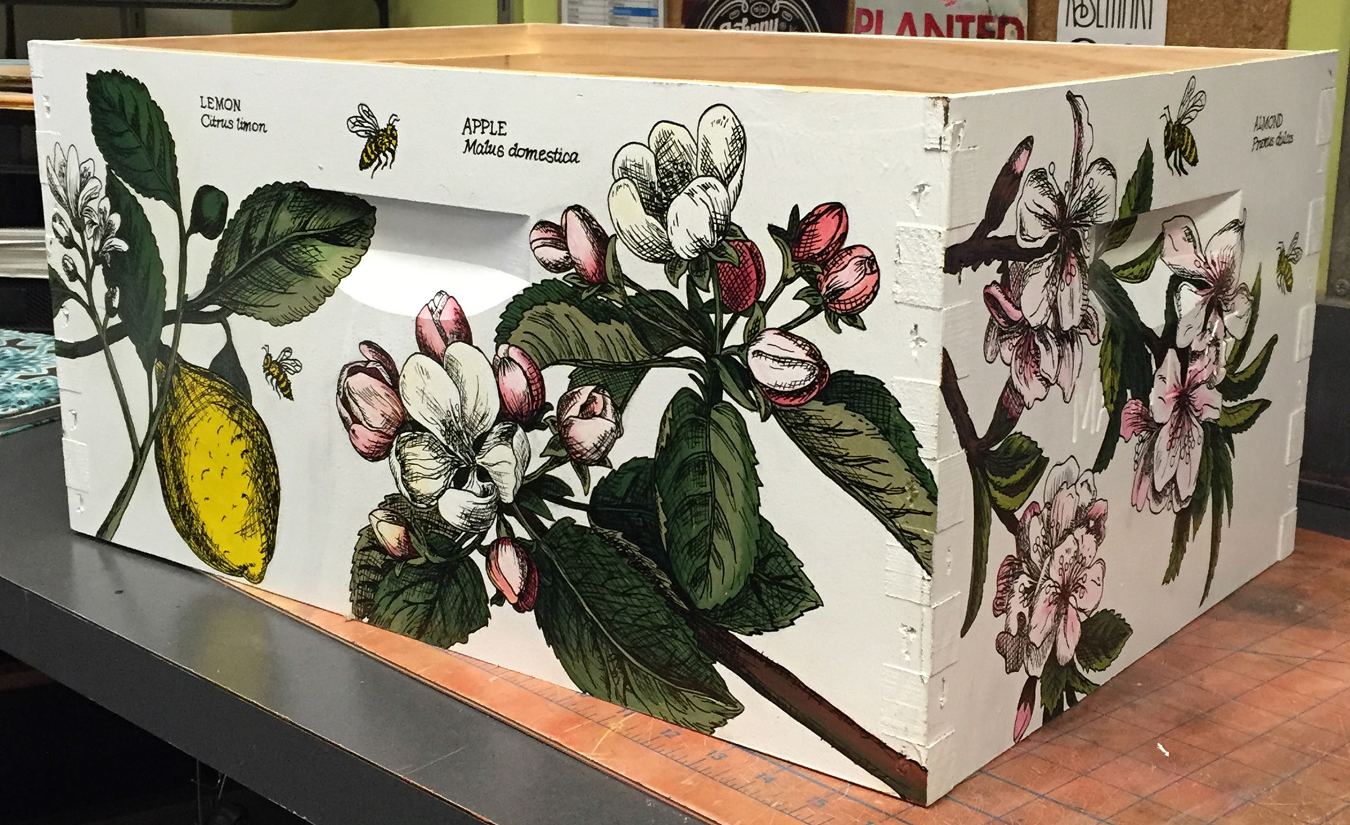 Decorated beehive used for raffle prize in store. This beehive design won the Whole Foods Market NorCal Regional design contest for best beehive design.